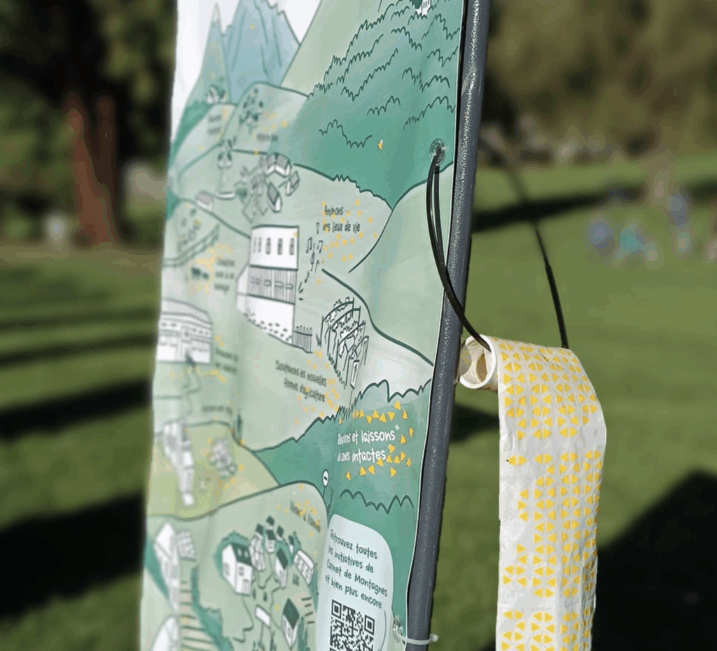 en 10 bâches qui se roulent et s'accrochent facilement sur des supports existants. Pensées pour l'extérieur, elles créent un sentier d’exposition.