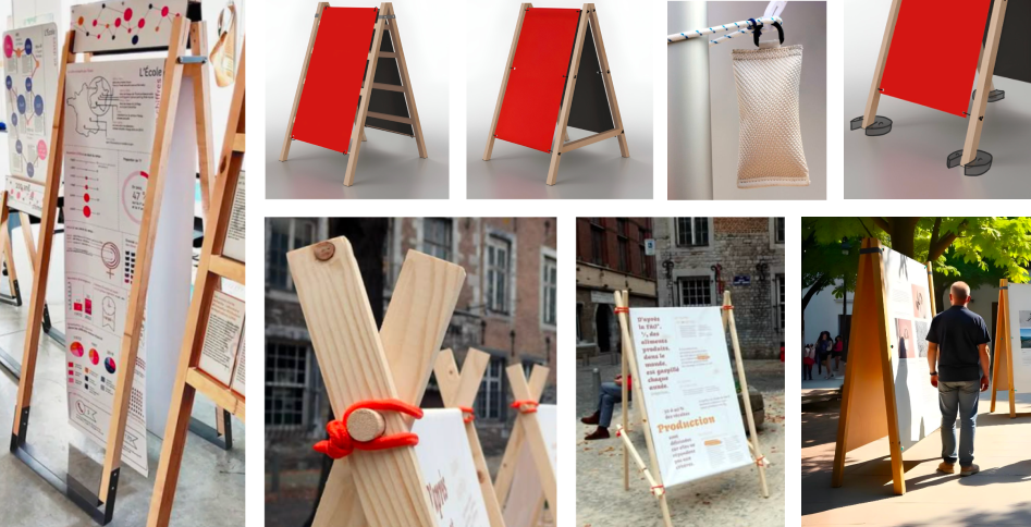 En mars, on les appelle pour leur parler de notre idée. On trouve que les bâches sont un super medium résistant et léger mais on aimerait que notre exposition soit plus ancrée et proposer un “package” complet avec des supports.